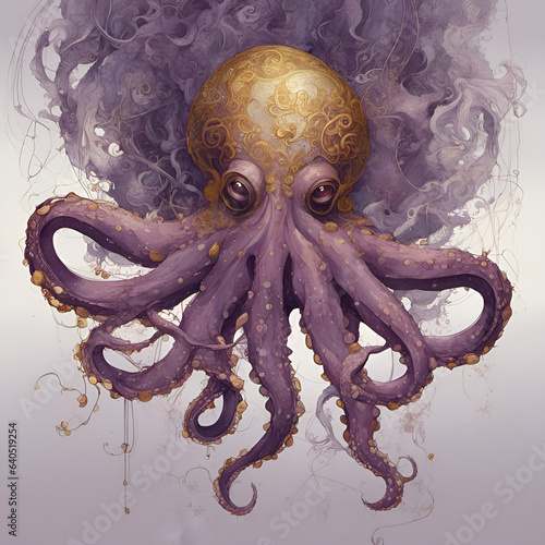 Golden Purple Octopus Camouflage Octopus Ink Intricate Motif Watercolor Painting ~ Created With Generative AI.