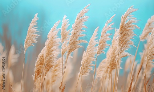Golden reeds sway in gentle breeze against turquoise sky, ideal nature background