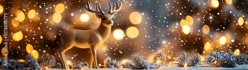 Golden Reindeer with Christmas Lights and Snow - Illustration