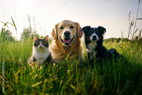 Golden Retriever and Collie dogs with a cat sitting in grass, smiling under a summer sunset