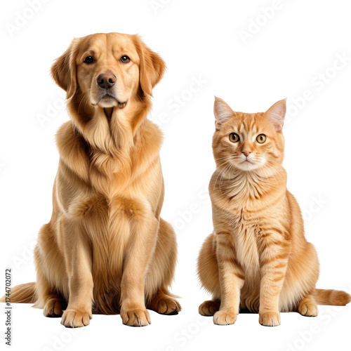 Golden retriever and ginger cat sitting side-by-side. Isolated image