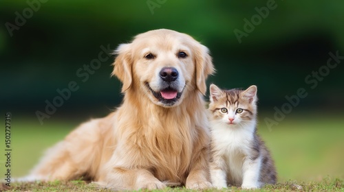 Golden retriever and kitten sharing a peaceful moment, soft fur glowing in warm light. Harmony between unlikely friends.