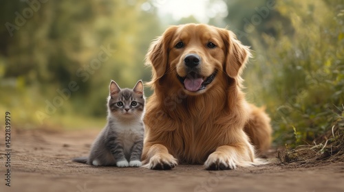 Golden retriever and tabby kitten sitting together on path