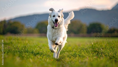 Golden Retriever Dog Running Through Field Of Green Grass On A Sunny Day With Blurred Trees and Mountain In Background