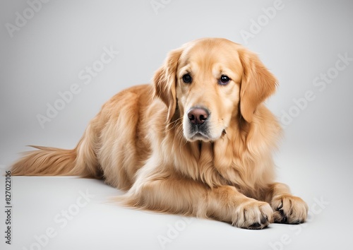 Golden Retriever dog sitting on the floor, isolated on a white background.