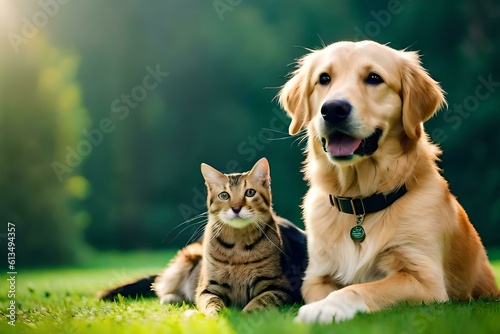 Golden retriever dog with cat beside it. Concept of friendship between animals. Dog and cat. Created with generative Ai technology.