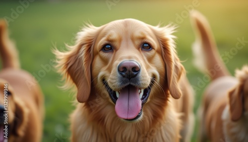 Golden Retriever Group Portrait with Green Background and Open Mouth