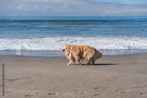 Golden Retriever is walking along the beach with the beautiful sea in the background.