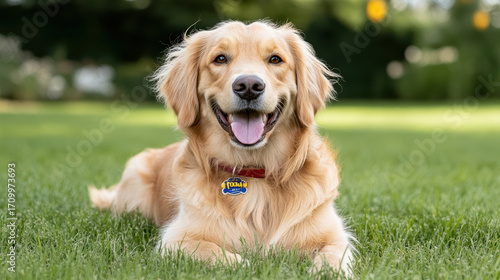 Golden retriever lying on grass, smiling happily, enjoying sunny day