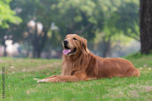 Golden Retriever lying on the grass