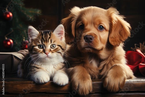 Golden Retriever puppy and tabby kitten on wooden background. Created with Generative AI tools