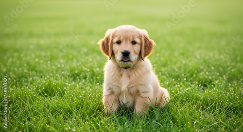 Golden retriever puppy sitting on green grass looking at the camera with a blurred background