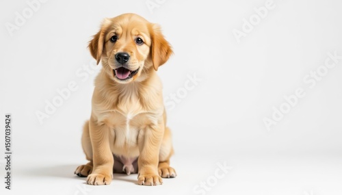 Golden Retriever puppy stands, pure white backdrop, close up, looking, young