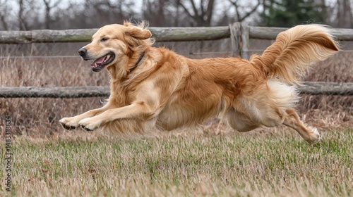 Golden retriever running across a grassy field.