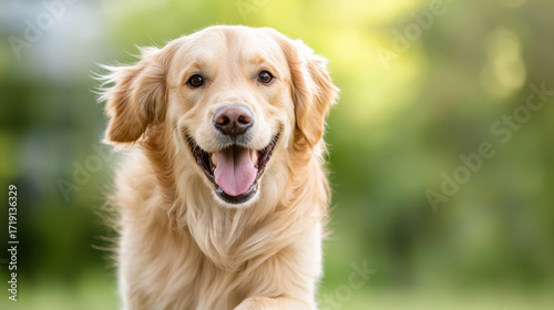 Golden retriever smiling in green field, showcasing joy and playfulness
