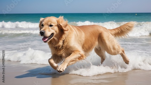 Golden Retriever with a joyful expression, running on the beach.