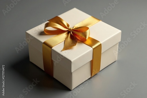 Golden ribbon tied around a rectangular gift box with a bow, gold ribbon wrap, decorative bow, premium gift
