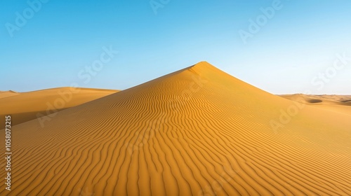Golden sand dune under clear sky with rippling patterns in desert landscape