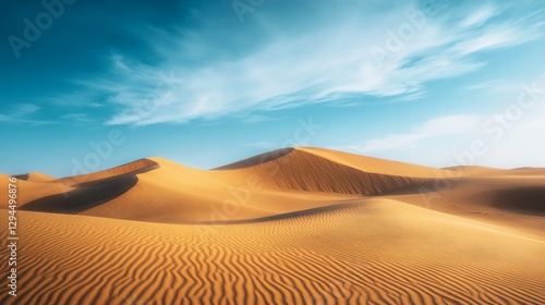 Golden sand dunes stretch endlessly under a vast sky, with rippled textures and gentle curves creating a mesmerizing desert landscape.