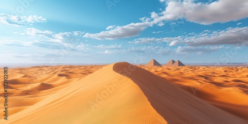 Golden sand dunes stretch under a blue sky with distant pyramids visible in early morning light