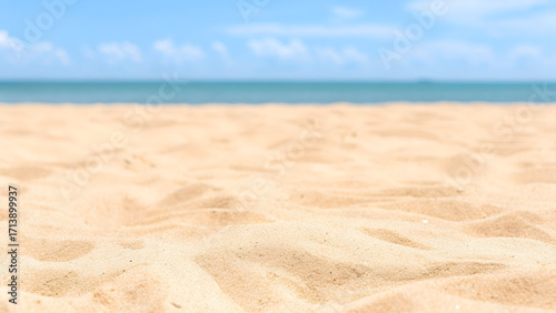 Golden Sandy Beach Foreground with Blurred Turquoise Ocean and Clear Blue Sky Background for Summer Vacations, Tropical Getaways, and Copy Space
