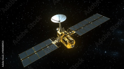 Golden Satellite Soaring Through the Cosmos: A 3D Render of a Communication Satellite Orbiting Earth