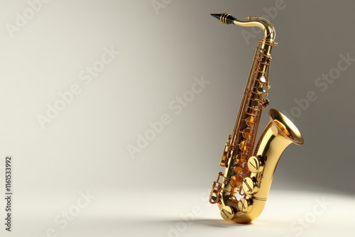 Golden saxophone standing alone on white surface, musical instrument, luxury item