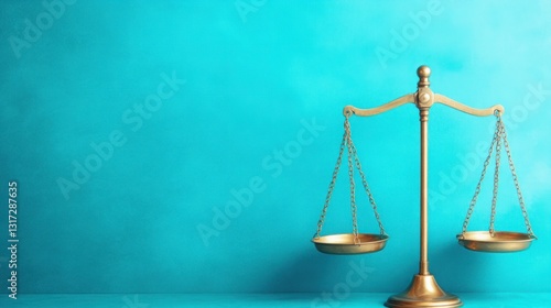 Golden Scales of Justice on Turquoise Background Symbolizing Fairness, Law, Balance, and Legal System in Modern Society