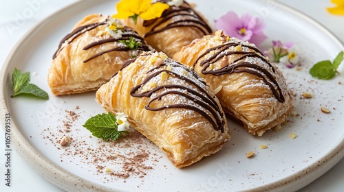 Golden sfogliatella with almond and chocolate garnish, on a white marble plate, with edible flowers and mint leaves