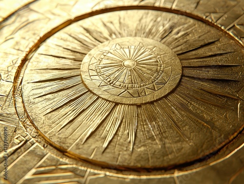Golden Shield Emblem: Intricate, radial design featuring geometric patterns and sunburst motifs, evoking strength and protection.