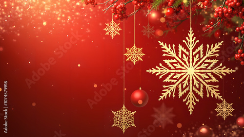 Golden snowflakes hanging on a red background with bokeh lights and berries for Christmas and winter holidays