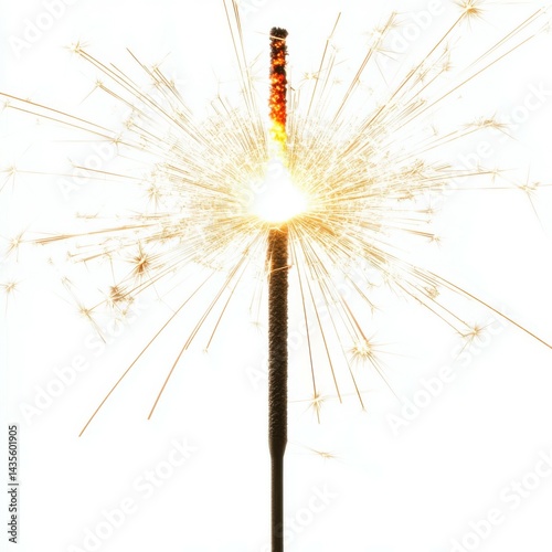 Golden sparkler in full spark against white, isolated on white background, bright and festive