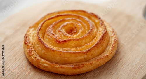 Golden Spiral Pastry on Wooden Board, Delicious Sweet Treat for Breakfast Time.