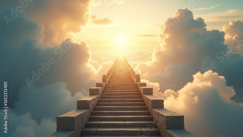 Golden Stairway Rising into the Sky with Sunlight and Clouds