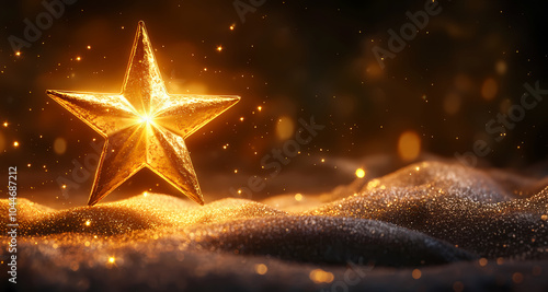 Golden star decoration shining brightly on soft, sparkly surface at night. Generative AI.