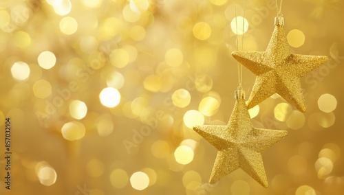 Golden star ornaments with a bright bokeh glitter background with copyspace for Christmas, New Year's Eve, festive holiday decorations