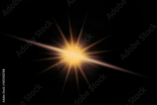 Golden Starburst Light Effect on Black Background, Glowing Sun Flare Abstract Overlay