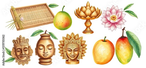 Golden Statues Fruits Flowers Bamboo Tray Asian Culture Illustration