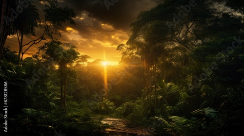 Golden sundown in the jungle with lots of sun rays in the dramatic sky