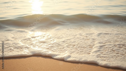 Golden sunlight reflecting on tranquil ocean waves gently lapping the sandy shore