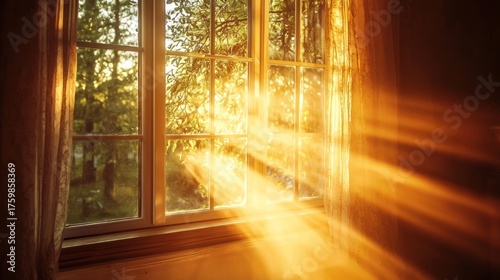 Golden Sunlight Streaming Through a Window with Dust Particles and Green Foliage, Creating a Warm and Ethereal Atmosphere Indoors