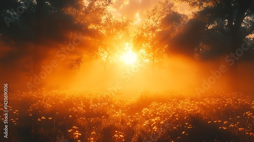 Golden Sunlight Streaming Through Trees Illuminating Meadow Of Flowers Photo