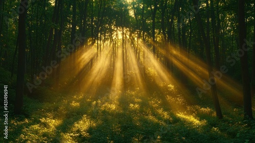 Golden sunlight streams through a dense forest. Sunlight beams through trees, illuminating the forest floor