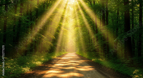 Golden sunlight streams through lush green forest trees, creating a stunning, ethereal woodland scene perfect for nature lovers and outdoor enthusiasts
