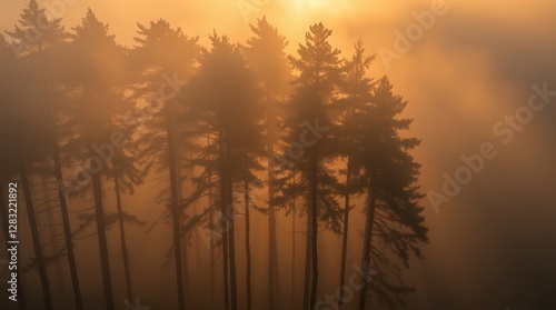 Golden sunrise illuminates a misty forest, creating a serene and peaceful atmosphere.