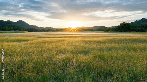Golden sunrise illuminating misty meadow with gentle warm tones, creating serene atmosphere