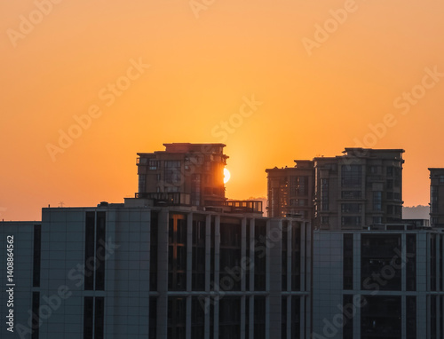 Golden sunrise illuminating modern buildings in an urban landscape