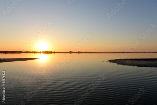 Golden sunrise over calm water