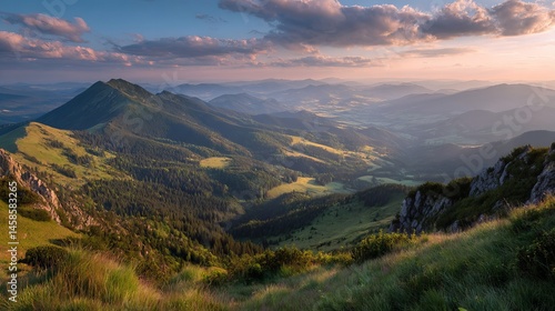 Golden sunrise over dewy grass in the rolling hills of the carpathian mountains