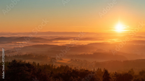 Golden Sunrise Panorama: A breathtaking panoramic shot of a stunning sunrise painting the sky with warm golden hues, as the sun ascends over a vast, serene landscape.